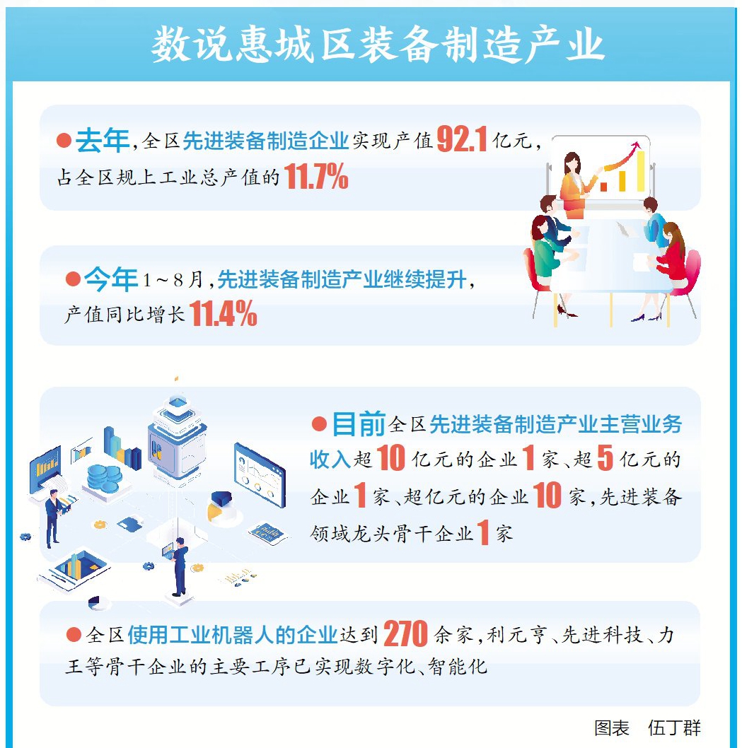 擁有競(jìng)爭(zhēng)力強(qiáng)的裝備制造產(chǎn)業(yè)集群是制造業(yè)高質(zhì)量發(fā)展的重要標(biāo)志之一。近年來(lái),惠城區(qū)高度重視,將裝備制造產(chǎn)業(yè)列為“3+3+X”產(chǎn)業(yè)體系的主導(dǎo)產(chǎn)業(yè),提出要發(fā)揮傳統(tǒng)優(yōu)勢(shì),堅(jiān)持內(nèi)外源并重、引進(jìn)與培育并舉,打造裝備制造產(chǎn)業(yè)高地。去年,先進(jìn)裝備制造企業(yè)實(shí)現(xiàn)產(chǎn)值92.1億元,占全區(qū)規(guī)上工業(yè)總產(chǎn)值的11.7%。今年1~8月,先進(jìn)裝備制造產(chǎn)業(yè)發(fā)展繼續(xù)提速,產(chǎn)值同比增長(zhǎng)11.4%,產(chǎn)業(yè)初具規(guī)模。