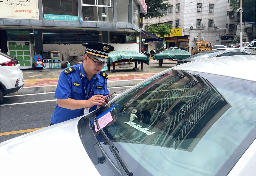 執(zhí)法隊員張貼“溫馨提示”善意勸離違停車輛。