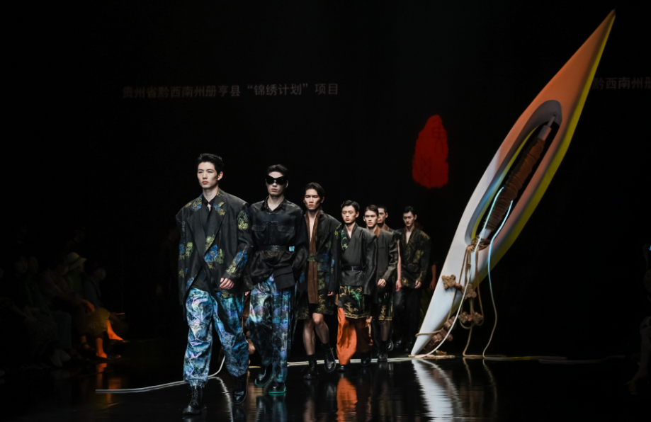 黃剛介紹:“‘錦繡中華’系列服裝能夠體現(xiàn)‘錦繡計(jì)劃’的初衷,冊(cè)亨有很多繡娘,還有做蠟染、吊染、扎染的一些匠人,他們?cè)O(shè)計(jì)制作的產(chǎn)品比較特別,我們把民族元素用到時(shí)尚的設(shè)計(jì)里,讓非遺跟現(xiàn)代結(jié)合、跟科技結(jié)合,于是有了今天精彩的呈現(xiàn)!