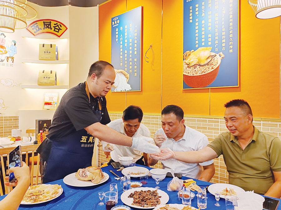 五鳳谷古法鹽焗雞負(fù)責(zé)人吳金標(biāo)與客人分享鹽焗雞。