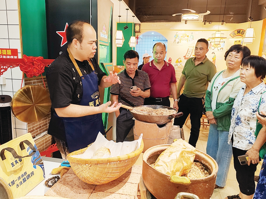 五鳳谷東江古法鹽焗雞創(chuàng)始人吳金標(biāo)展示鹽焗雞。