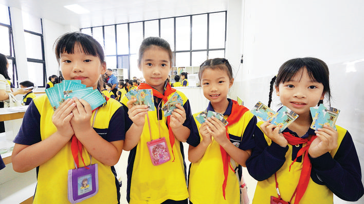 惠州市南壇小學(xué)鼎峰分校校長張月銘告訴記者,開設(shè)“鼎一兌換超市”主要是為創(chuàng)新學(xué)校的激勵機制,同時開展學(xué)生職業(yè)體驗,培養(yǎng)學(xué)生的理財意識。孩子們手里拿的“鼎一幣”看起來類似一張銀行卡,上面有包含該!岸σ弧蔽幕瘍(nèi)涵的漫畫設(shè)計!拔覀儗iT成立‘鼎一幣’設(shè)計項目組,面向師生和家長征集設(shè)計圖案,不少作品設(shè)計巧妙,經(jīng)過我們辦公室和美術(shù)科組的評選,最終三年級1班吳雨微同學(xué)的作品當(dāng)選。”學(xué)校制作了上萬張卡,每個月為學(xué)校每位教職員工發(fā)放100張“鼎一幣”,大家可根據(jù)自己的標(biāo)準(zhǔn)去獎勵學(xué)生。“為了體現(xiàn)全員育人的理念,我們學(xué)校的保潔、保安都可以給表現(xiàn)優(yōu)秀的孩子發(fā)幣!睆堅裸懡榻B說,超市的獎品都是孩子們喜歡的文體用品,有的是學(xué)校購買,有的是愛心家長捐贈,還加入了免作業(yè)券、和校長合影券等精神方面的獎勵。