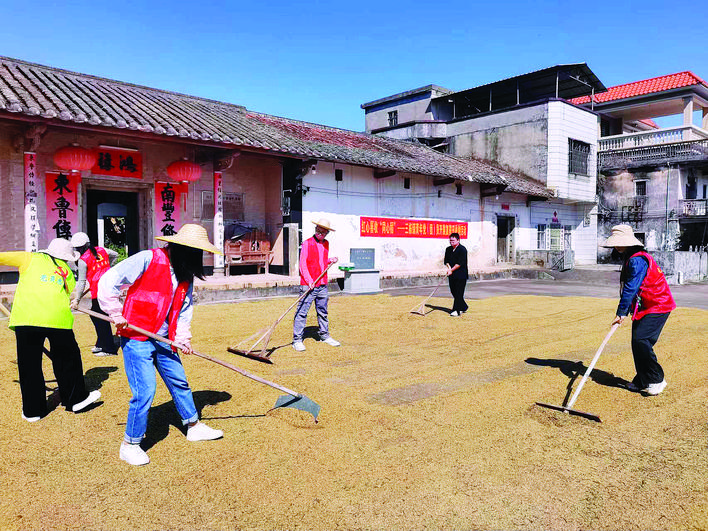 黨群一起晾曬稻谷。 惠州日報記者彭紅霞 通訊員鄭艷芳 李曼琦 攝