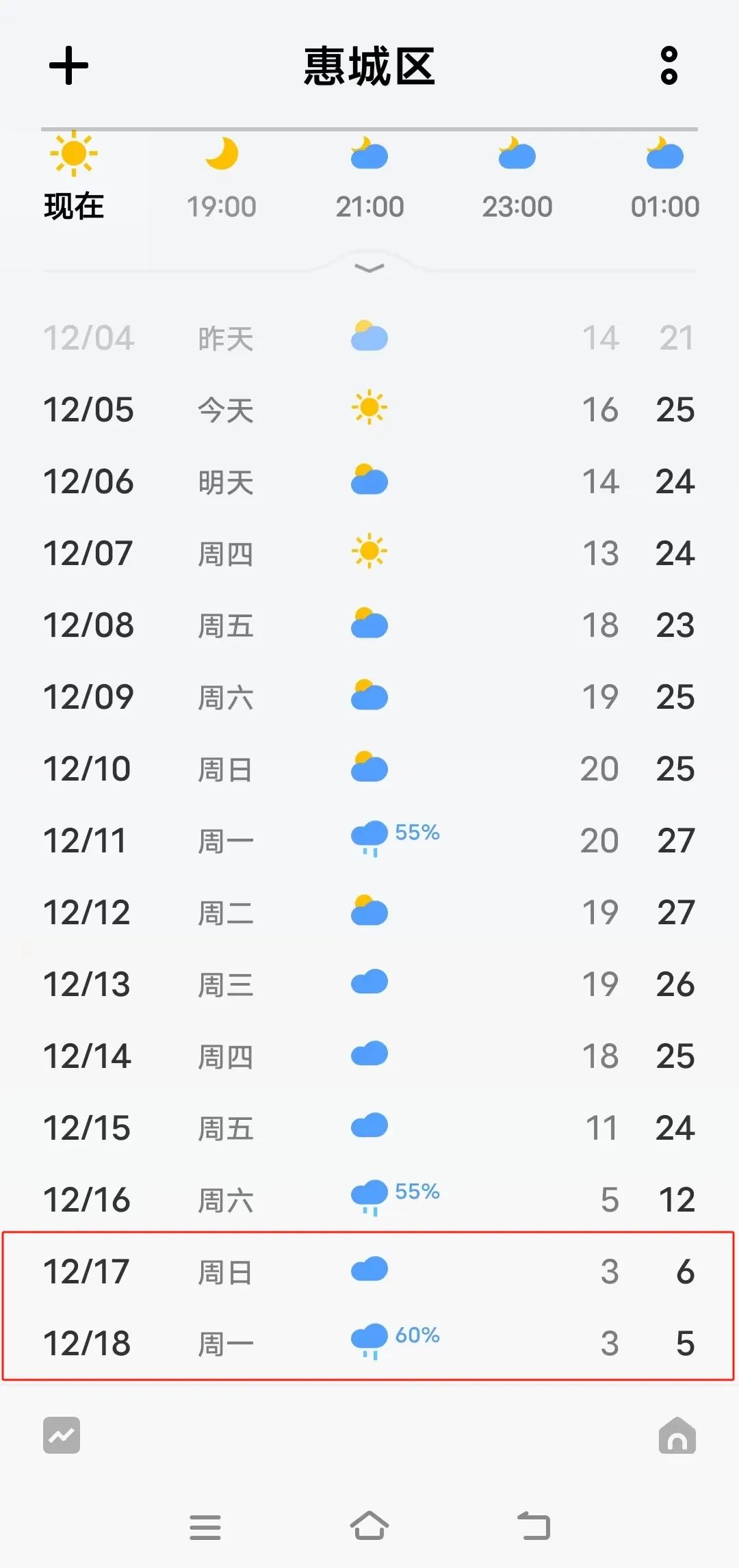 根據(jù)各網(wǎng)友發(fā)送給氣象部門的手機(jī)頁面截圖,上述截圖大致反映12月中旬廣東部分地區(qū)出現(xiàn)降溫走勢(shì),至12月18日前后出現(xiàn)過程低溫。從預(yù)報(bào)結(jié)論看,屆時(shí)惠州惠城區(qū)最低氣溫僅2~3℃;廣州市區(qū)最低氣溫僅1℃,最高也僅3℃,不僅天氣寒冷還可能出現(xiàn)雨夾雪。