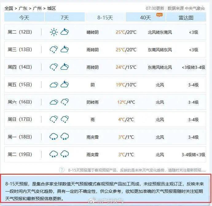 部分提供該類預(yù)報(bào)的網(wǎng)站會(huì)提醒公眾該類預(yù)報(bào)存在的不確定性。圖源:@廣州天氣