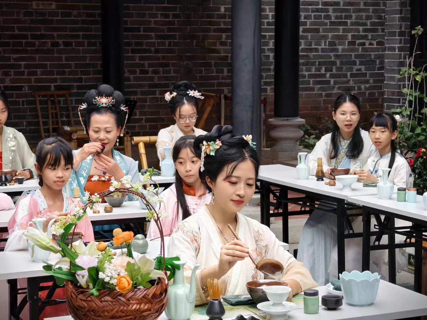 “點(diǎn)茶、焚香、插花、掛畫”合稱大宋四雅,是宋代文人雅士追求雅致生活的方式!皞鞑|坡文化,首先要尋找環(huán)境結(jié)合點(diǎn),置身東坡祠場(chǎng)景,再通過復(fù)原裝束,體驗(yàn)‘大宋四雅’,以看得見摸得著的方式體驗(yàn)古代文人雅致生活。這樣大家就會(huì)發(fā)現(xiàn),其實(shí)古代藝術(shù)離我們生活并不遠(yuǎn)!秉S祎然說。