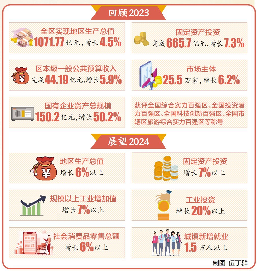 經(jīng)濟發(fā)展承壓而上。全區(qū)實現(xiàn)地區(qū)生產(chǎn)總值1071.77億元,增長4.5%。固定資產(chǎn)投資完成665.7億元,增長7.3%。區(qū)本級一般公共預算收入完成44.19億元,增長5.9%。市場主體25.5萬家,增長6.2%。國有企業(yè)資產(chǎn)總規(guī)模150.2億元,增長50.2%。獲評全國綜合實力百強區(qū)、全國投資潛力百強區(qū)、全國科技創(chuàng)新百強區(qū)、全國市轄區(qū)旅游綜合實力百強區(qū)等稱號。
