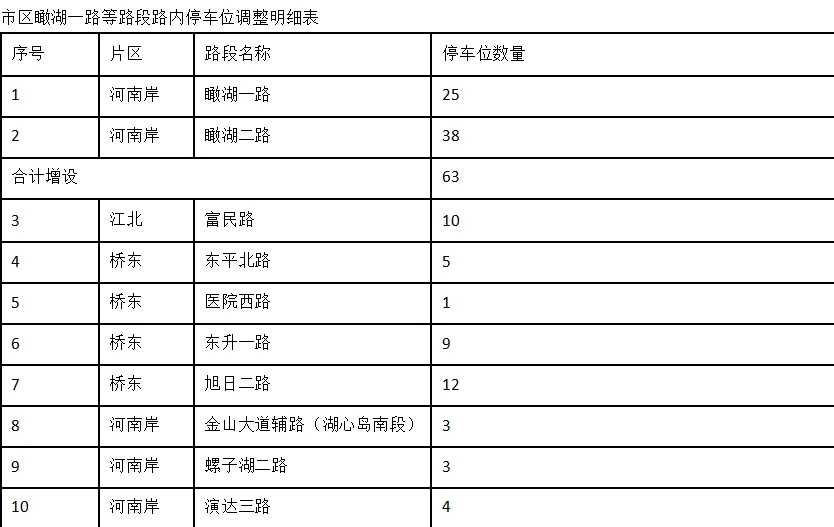 近日,市公安局交警支隊發(fā)布《關(guān)于市區(qū)瞰湖一路等路段路內(nèi)停車位調(diào)整的通告》;葜萁痪瘺Q定對市區(qū)部分路段路內(nèi)機動車停車位進行調(diào)整,其中河南岸片區(qū)瞰湖一路等2條路段增設(shè)63個停車位,江北片區(qū)富民路等16條路段撤除155個停車位。