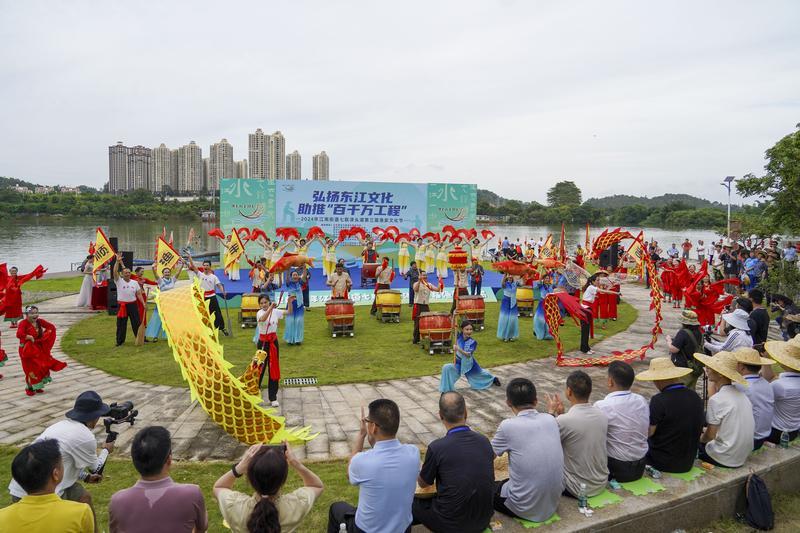 在隨后的文藝表演中,各個節(jié)目輪番上演:以東江漁家為主題情景的歌舞《鑼鼓一響慶開漁》,融合了鑼鼓、東江客家歌謠、舞龍、扇舞等藝術(shù)形式及東江漁家傳統(tǒng)民俗元素;漁家舞蹈《太陽出來喜洋洋》,通過喜慶歡快的舞蹈展示新時代農(nóng)民熱火朝天的干勁,展現(xiàn)新時代漁家人民積極昂揚(yáng)、團(tuán)結(jié)協(xié)作的精神面貌……據(jù)悉,此次漁家文化節(jié)的節(jié)目都是由江南街道本地村民、青年干部職工、津頭湖鑼鼓隊、舞蹈隊等參與編排演出,精彩的表演獲得了現(xiàn)場觀眾的熱烈掌聲。
