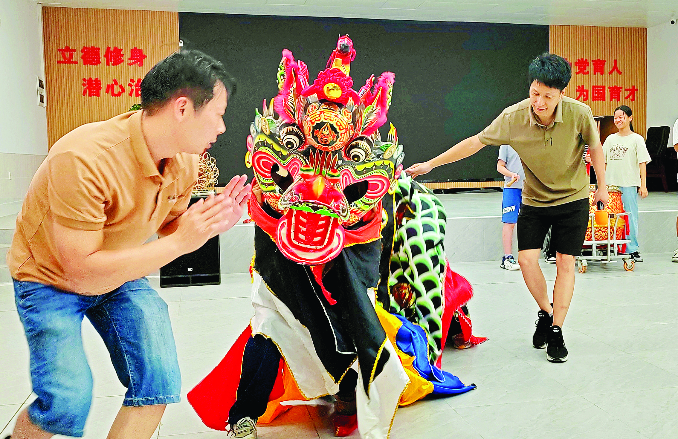 “咚咚咚!咚咚咚!”伴隨著激昂鑼鼓聲,學(xué)員們頭戴麟首,身手矯健地跳躍、翻滾,將麒麟的威猛與靈動(dòng)展現(xiàn)得淋漓盡致。這是日前在三棟鎮(zhèn)演達(dá)中學(xué)進(jìn)行的麒麟舞公益培訓(xùn)精彩的結(jié)課表演。