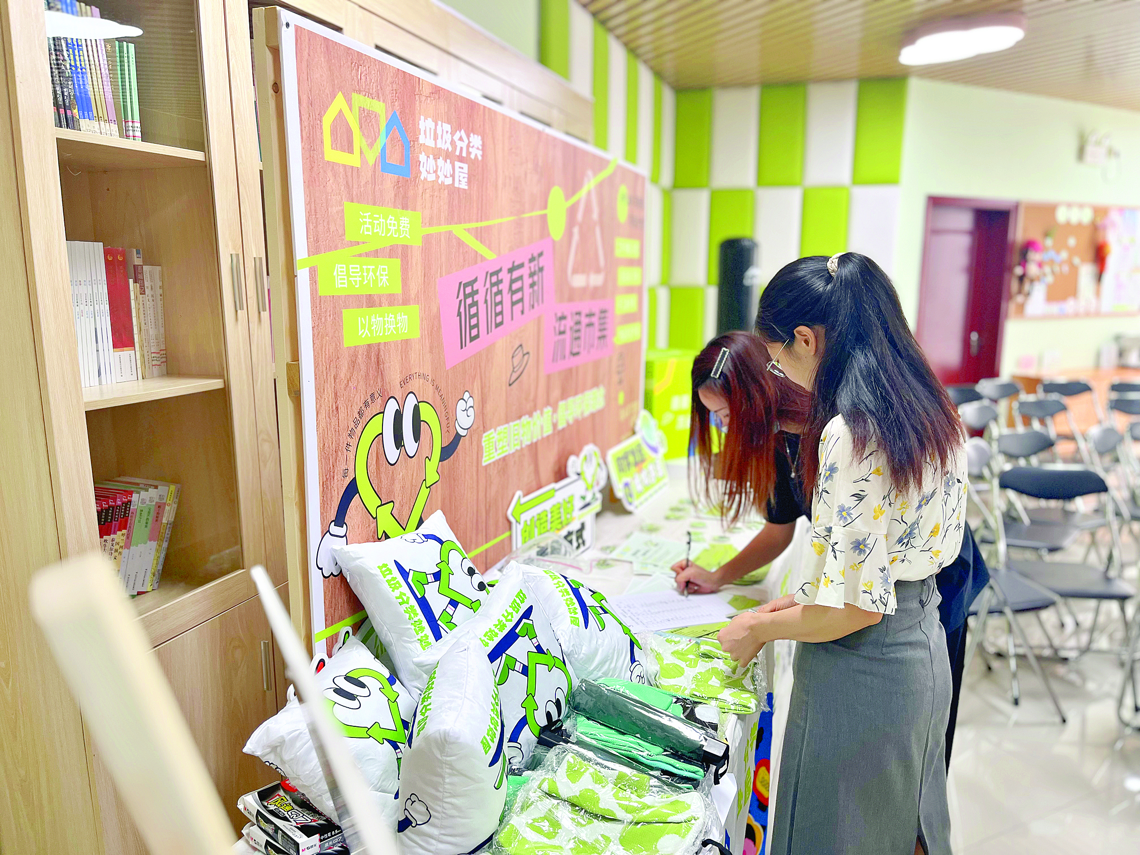 活動中,30名“回家”黨員先在展示架和打卡區(qū)了解舊物置換規(guī)則和學(xué)習(xí)垃圾分類知識,然后帶著家里閑置的玩具、電子產(chǎn)品、圖書等來到互動置換體驗(yàn)區(qū),寫下舊物置換心愿卡,并從“妙妙屋”中置換心儀的物品。