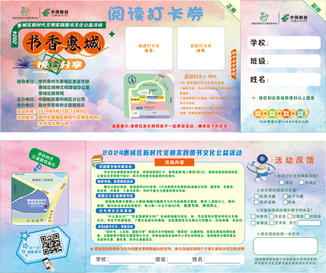 凡在活動現場完成閱讀打卡并蓋紀念章的學生,將為學校贏得校園捐贈圖書。活動現場設立書展區(qū)、閱讀打卡區(qū),引導協助學生完成閱讀打卡并蓋紀念章;顒咏Y束后由中國郵政惠城區(qū)分公司統一收集有效閱讀打卡券,經核對后,中國郵政惠城區(qū)分公司按照每卡10元碼洋的標準向學校贈送相應額度的圖書。