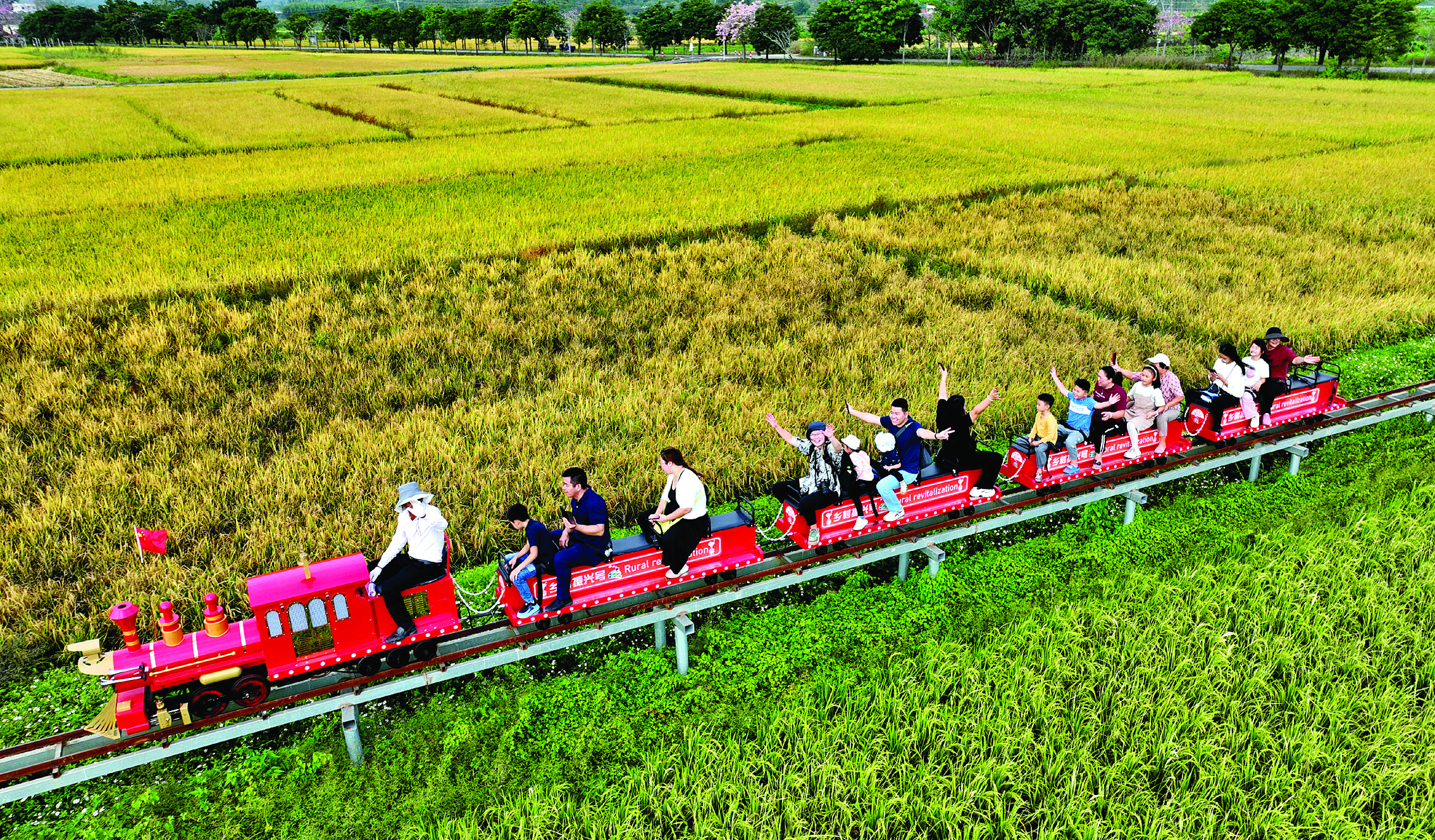 10月27日,游客在惠城區(qū)橫瀝鎮(zhèn)墨園村乘坐稻田小火車,沉浸式體驗(yàn)秋收“豐”景。作為廣東省“百千萬工程”首批典型村,近年來墨園村以鄉(xiāng)村振興為主線,依托古建筑群、歷史文化,打造農(nóng)文旅串聯(lián)產(chǎn)業(yè)。營地喝咖啡、鄉(xiāng)間圍爐煮茶、稻田乘坐小火車等一個(gè)個(gè)鄉(xiāng)村文旅項(xiàng)目落地。秋收時(shí)節(jié),一撥又一撥游客走進(jìn)滿地金黃的墨園村,體驗(yàn)耕種的辛勞和收獲的喜悅。