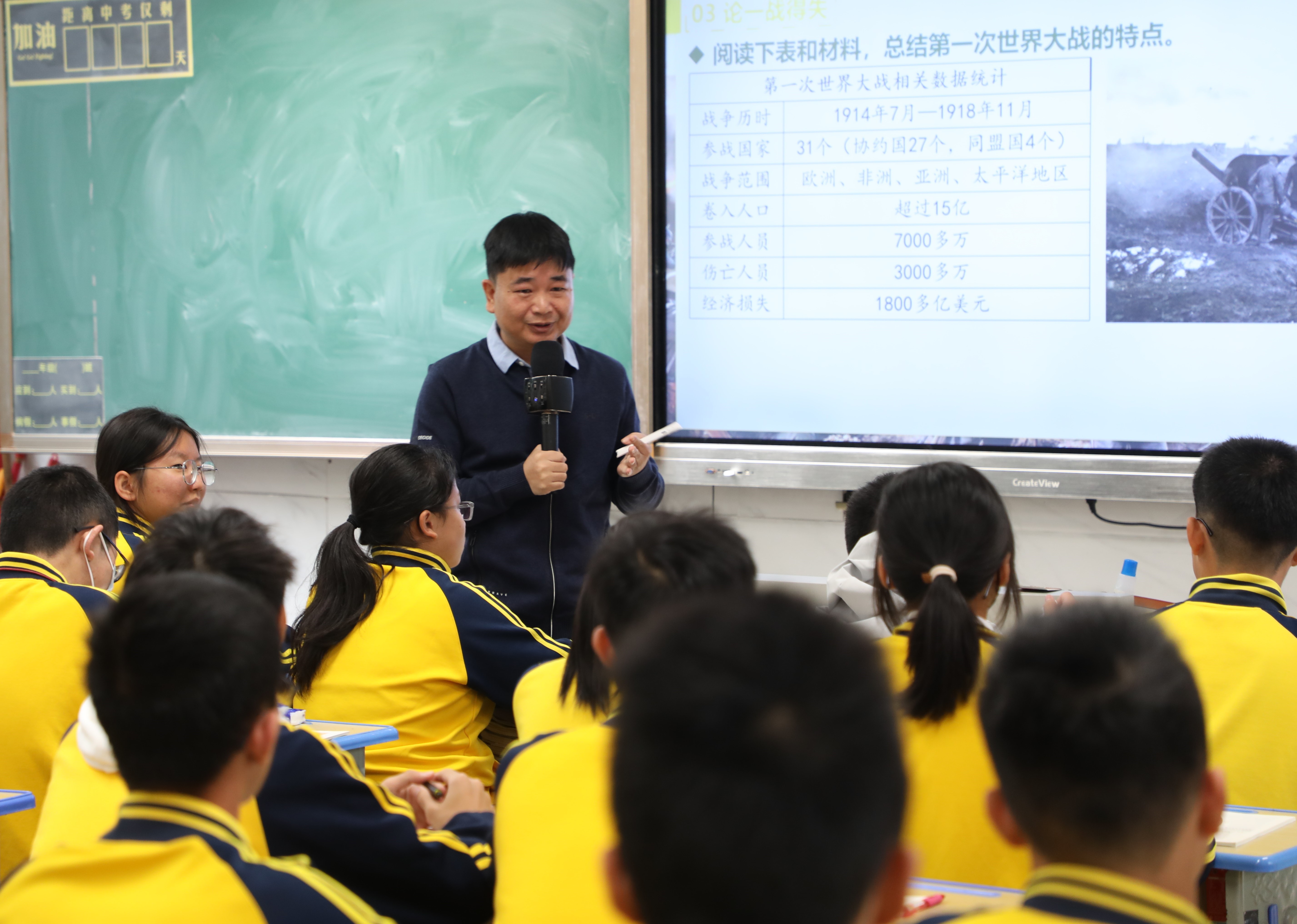 “大家覺(jué)得,具備什么樣的因素才會(huì)爆發(fā)戰(zhàn)爭(zhēng)?有同學(xué)說(shuō),要有矛盾,那么矛盾從何而來(lái)呢?”日前,記者來(lái)到惠臺(tái)學(xué)校采訪時(shí),正逢鄧文明在給初三年級(jí)的學(xué)生上歷史課。這堂課講的是世界現(xiàn)代史。課堂上,鄧文明以任務(wù)驅(qū)動(dòng)、隨機(jī)提問(wèn)的方式來(lái)激發(fā)大家提問(wèn)題、答問(wèn)題的興趣,通過(guò)與學(xué)生積極互動(dòng),并借助圖文、視頻等可視化教學(xué),來(lái)提升學(xué)生對(duì)戰(zhàn)爭(zhēng)背后的經(jīng)濟(jì)、科技等底層邏輯的理解能力。
