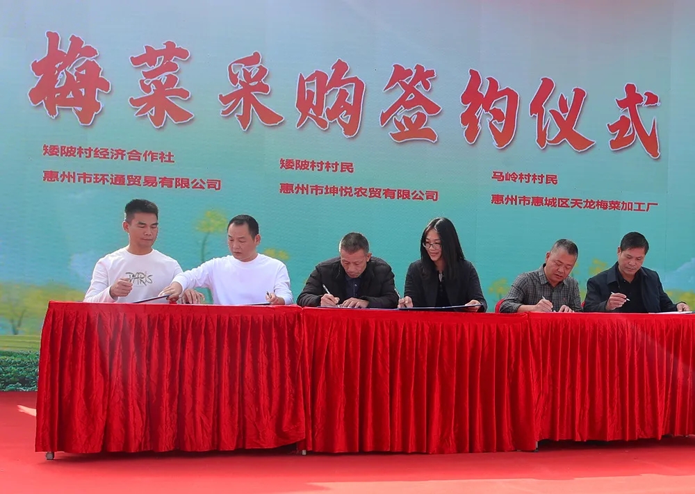 產(chǎn)業(yè)的發(fā)展離不開產(chǎn)銷結(jié)合;顒又校榇褰(jīng)濟(jì)合作社與惠州市環(huán)通貿(mào)易有限公司、矮陂村村民代表與惠州市坤悅農(nóng)貿(mào)有限公司、馬嶺村村民代表與惠州市惠城區(qū)天龍梅菜加工場分別簽訂梅菜采購協(xié)議,大力推動種植戶與梅菜企業(yè)、農(nóng)民合作社與種植企業(yè)合作,進(jìn)一步保障梅菜品質(zhì),規(guī)范生產(chǎn)標(biāo)準(zhǔn),拓寬梅菜銷售渠道。