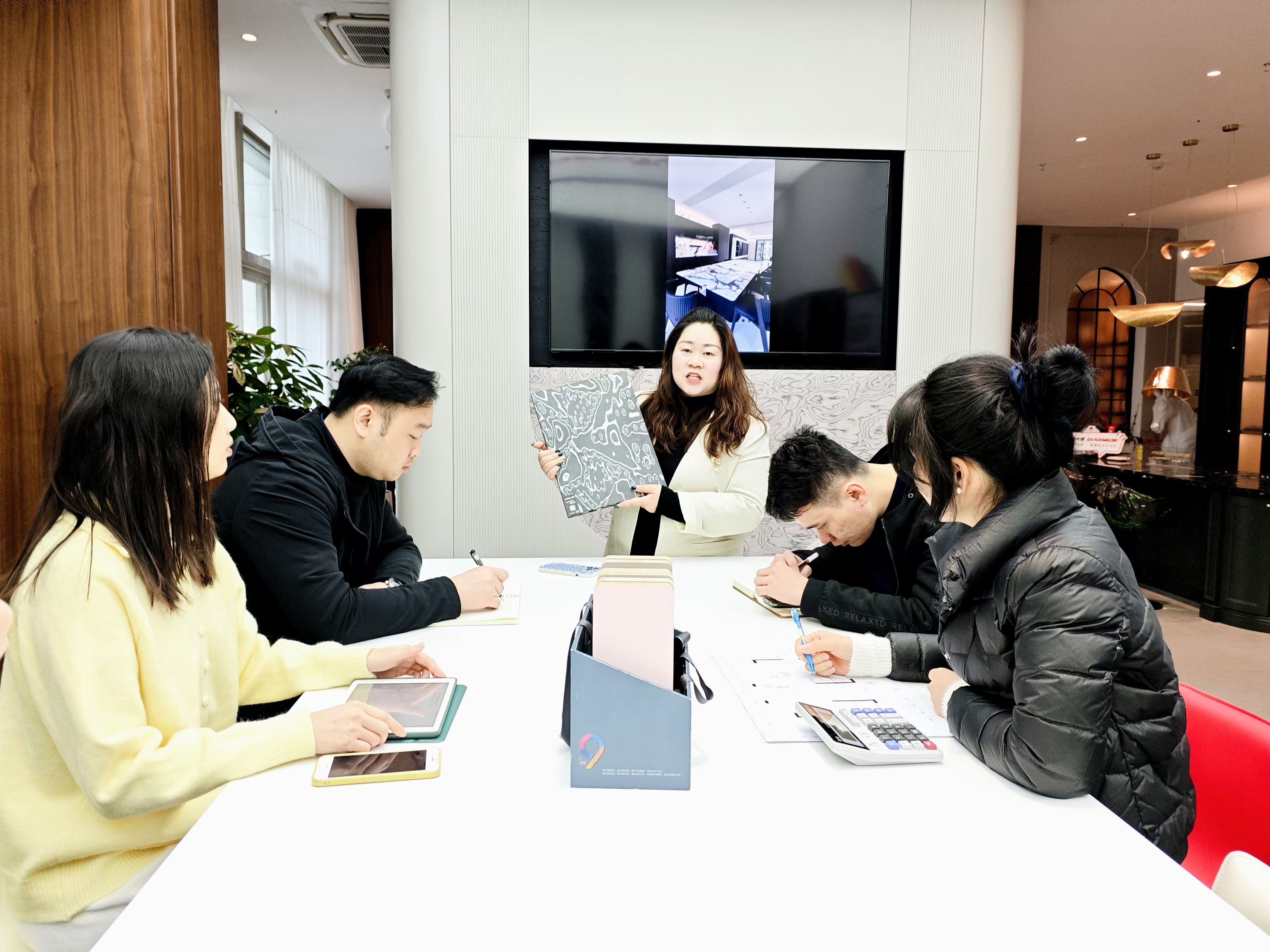 潘梅(中)與設(shè)計(jì)師們開(kāi)會(huì)討論家居定制方案。