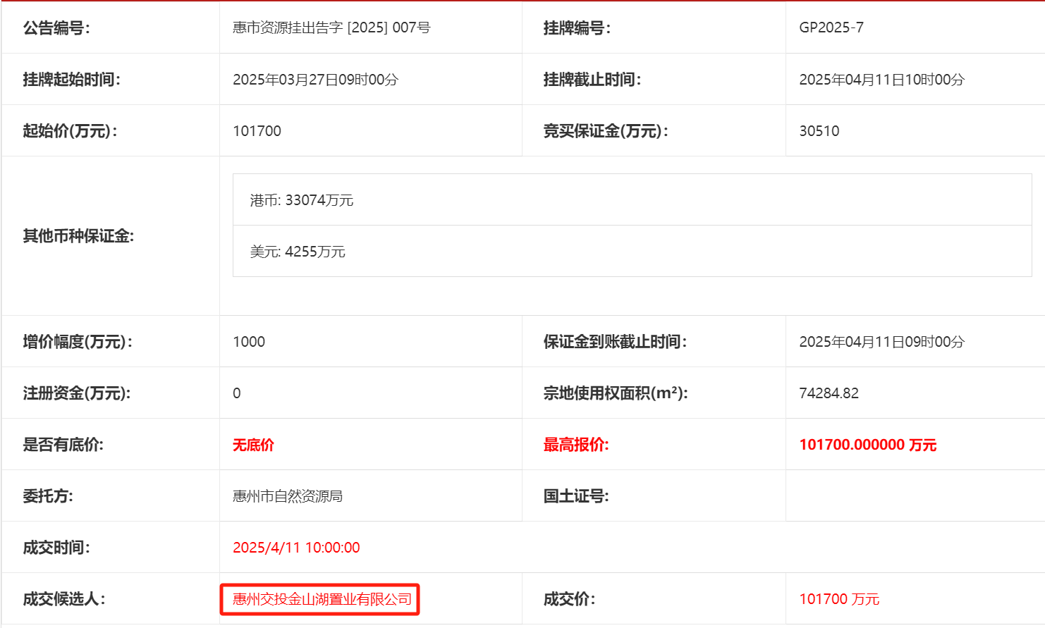 繼惠東濱海涉宅地塊、惠城區(qū)金山湖地塊成功出讓后,4月11日,惠城金龍大道東南片區(qū)JBD54-05、JBD54-06、JBD54-07地塊,被惠州交投金山湖置業(yè)有限公司以底價(jià)10.17億元摘牌,折合樓面價(jià)約4416.3元/平方米。