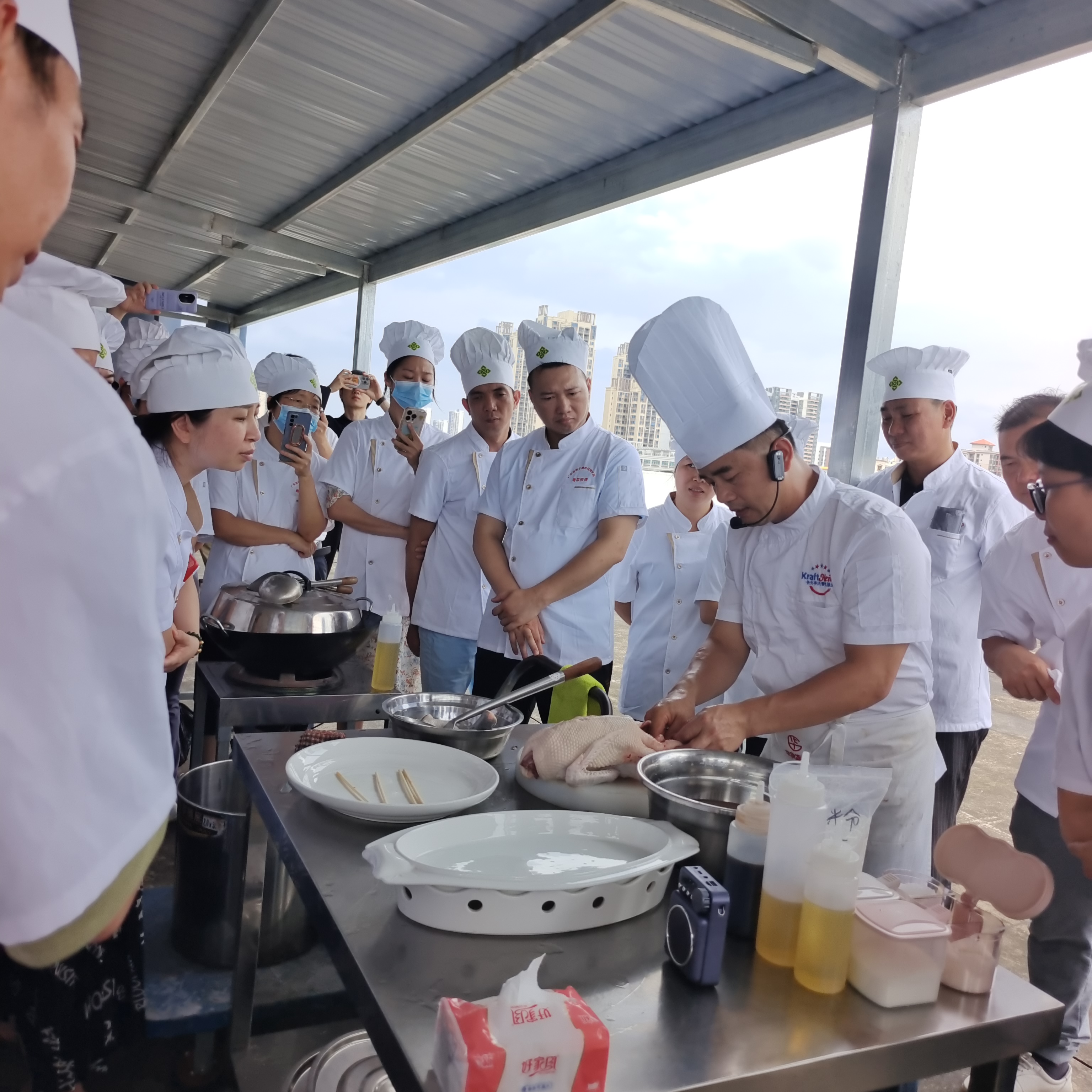 培訓(xùn)現(xiàn)場(chǎng),廣東省“粵菜師傅”五星級(jí)名廚、惠州市首席技師曾世英向?qū)W員講授了胡椒鴨的做法,學(xué)員們圍成一圈,仔細(xì)觀摩老師的操作,不時(shí)拍照記錄,并動(dòng)手實(shí)踐,現(xiàn)場(chǎng)鍋碗瓢盆清脆作響,學(xué)習(xí)氛圍濃厚。