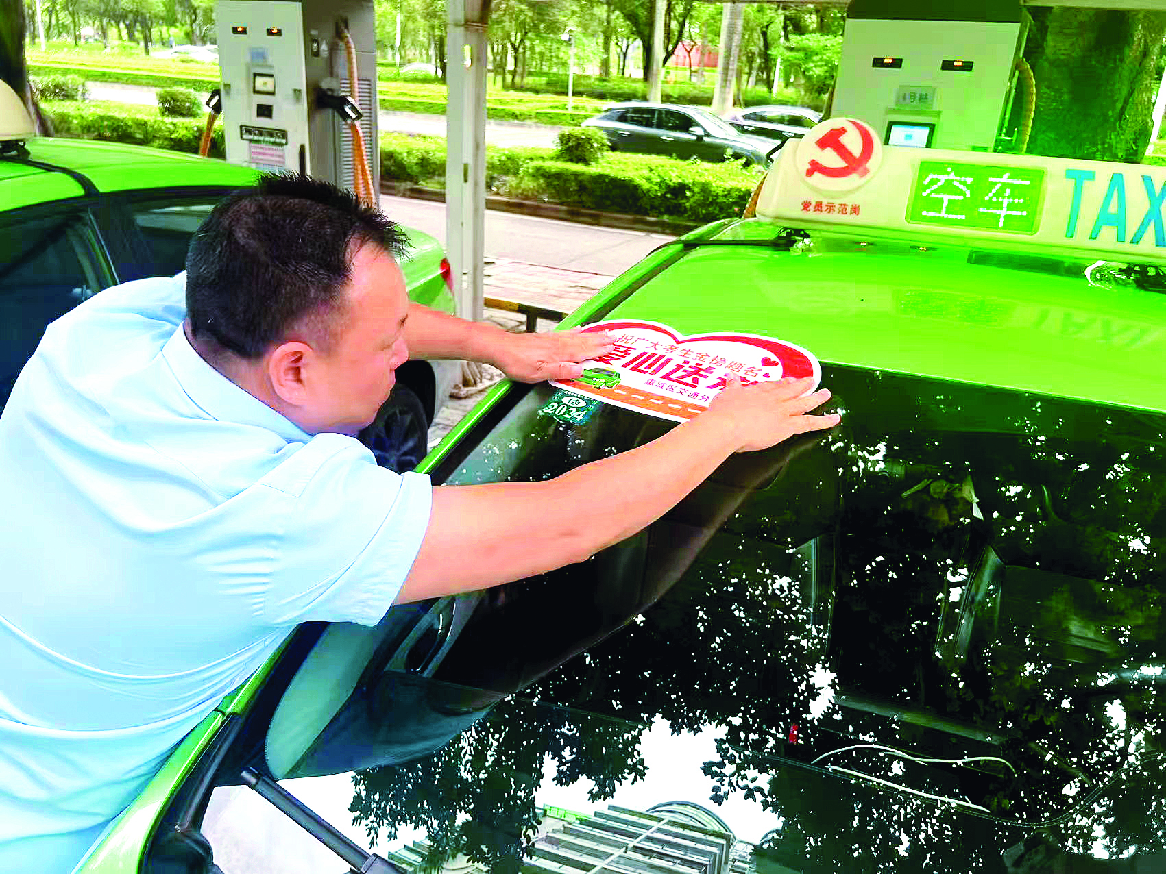 一位車主在張貼“愛心送考”標(biāo)識(shí)。惠州日?qǐng)?bào)記者葉文青 攝