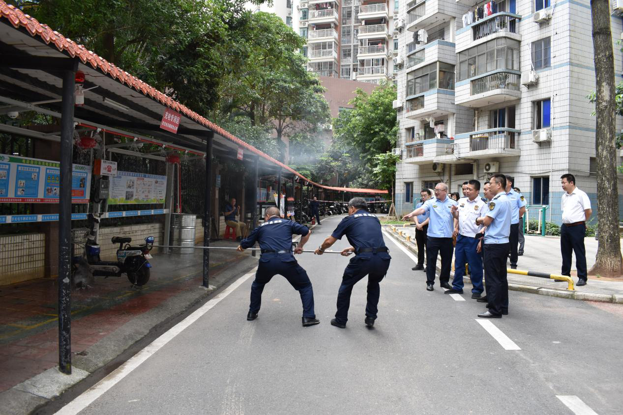 金沙俊園小區(qū)開展消防演習(xí),設(shè)備噴淋滅火后,物業(yè)人員勾出起火車輛。
