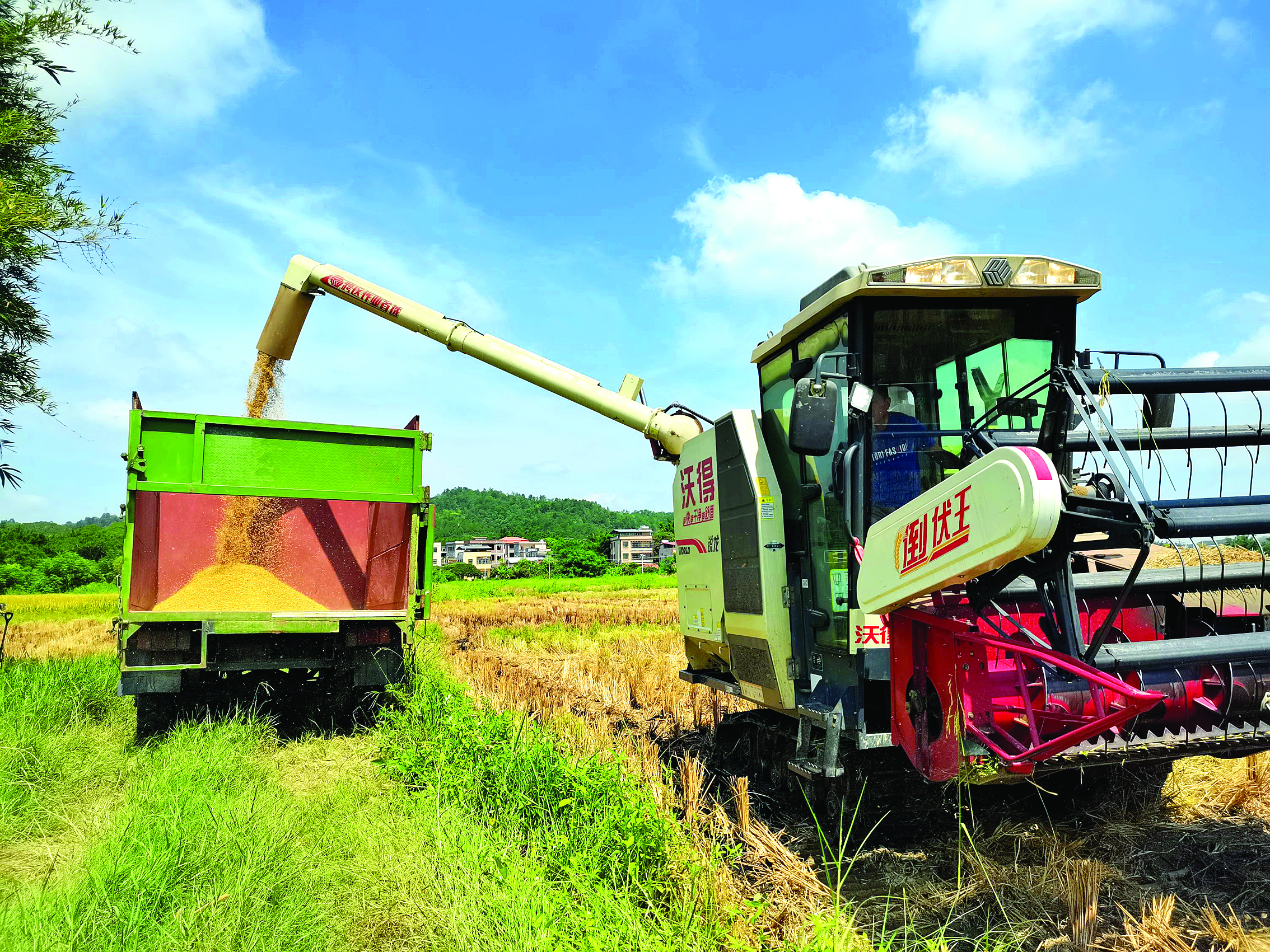 采訪當(dāng)天,烈日高懸。農(nóng)民正抓緊晴好天氣在田間收割水稻。在橫瀝鎮(zhèn)洋圳村種糧大戶鄭松貴的稻田,記者看到沉甸甸的稻穗彎了腰,鄭松貴開著收割機(jī),在田間來回穿梭。不久,一大片黃澄澄的水稻田只剩下稻茬。收割機(jī)收滿后,鄭松貴家人把一輛農(nóng)用車開到了機(jī)耕道旁。隨著一陣“轟隆隆”的機(jī)器聲響起,稻谷經(jīng)過初步去穗脫粒后,金色的“谷雨”從收割機(jī)高高架起的管道中注入農(nóng)用車,很快就裝滿了一車。