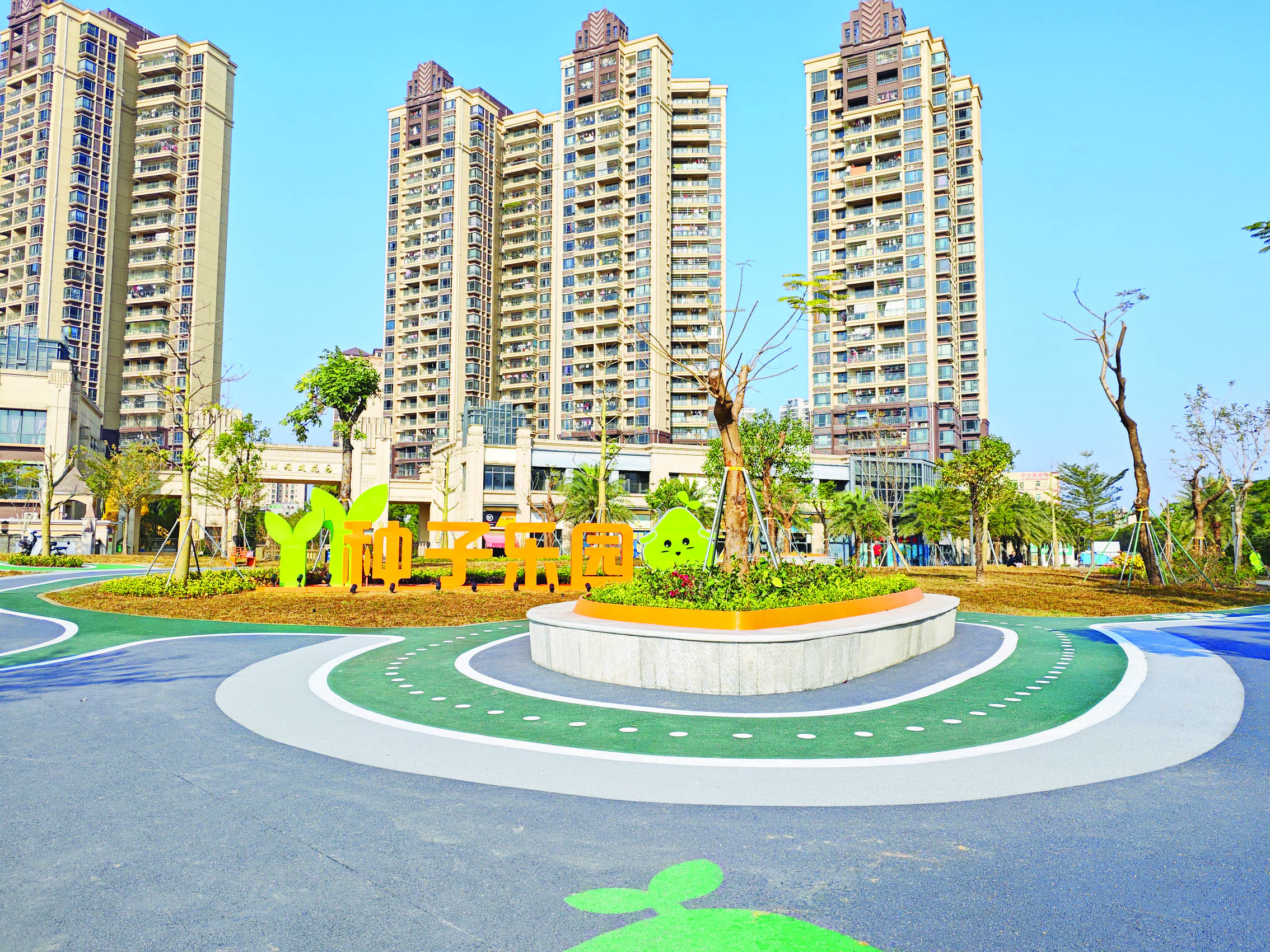 “種子樂(lè)園”鋪設(shè)綠色為主色調(diào)的橢圓形地板(形似種子),安裝庭院燈、射燈等照明設(shè)施,對(duì)4456平方米綠化面積全部安裝噴淋系統(tǒng),布置特色座凳、廊架和兒童砂池、種植科普等游樂(lè)及教學(xué)設(shè)施,讓公園既體現(xiàn)現(xiàn)代化,又與自然環(huán)境相融合!胺N子樂(lè)園”已成為附近居民最喜歡的打卡點(diǎn)之一,日均接待量達(dá)200余人次。