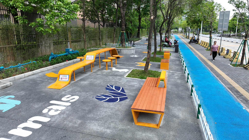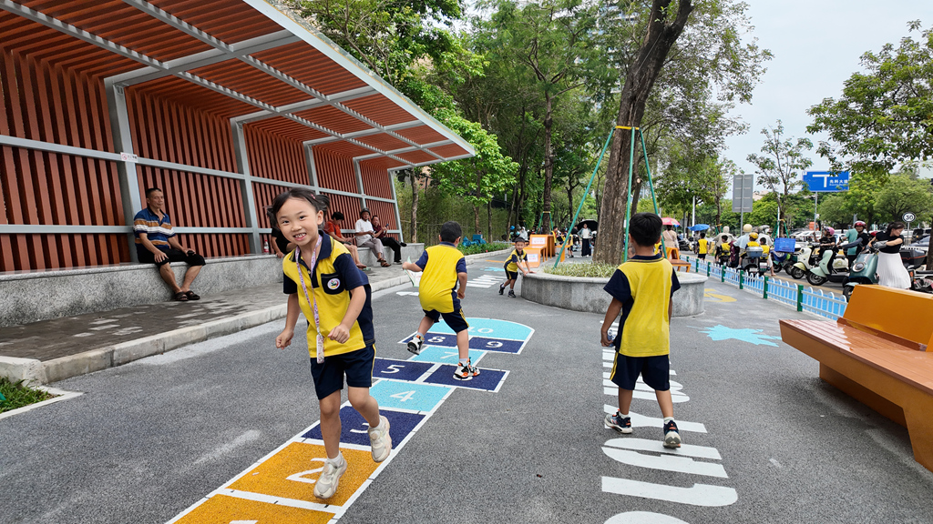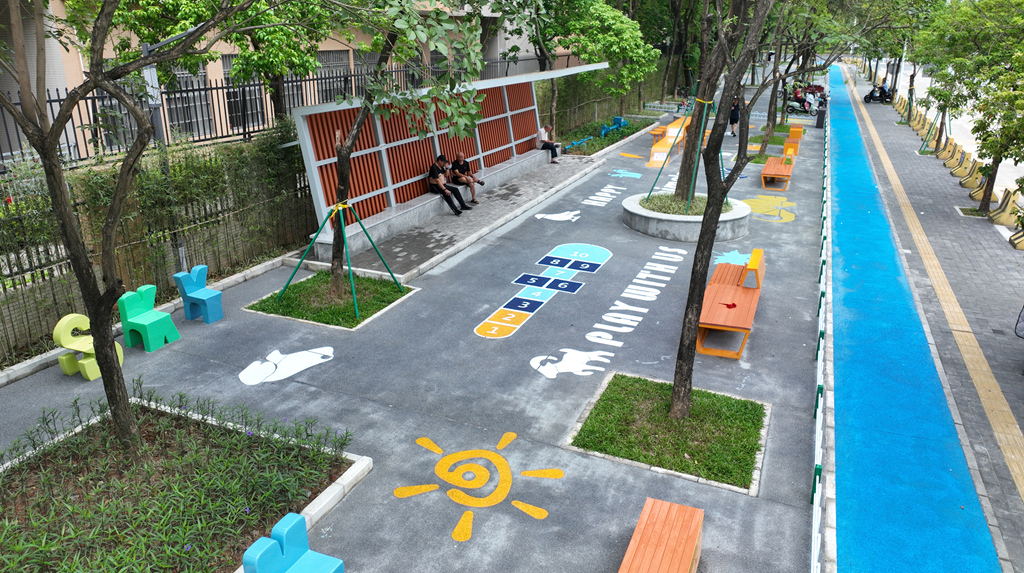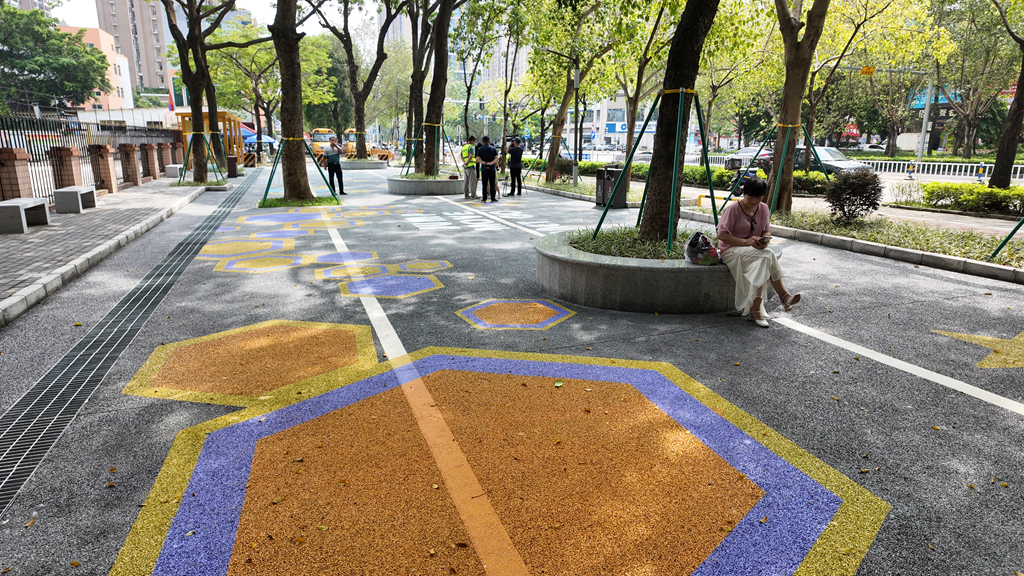 景觀煥新,充滿童趣:地面繪制的六邊形、五角星及太空星球圖案仿佛躍動的音符,勾勒出一處激發(fā)想象力的游戲樂園。陽光透過廊架及枝葉灑下斑駁光影,整片綠地宛如一幅現(xiàn)代與自然交融的生動畫卷。