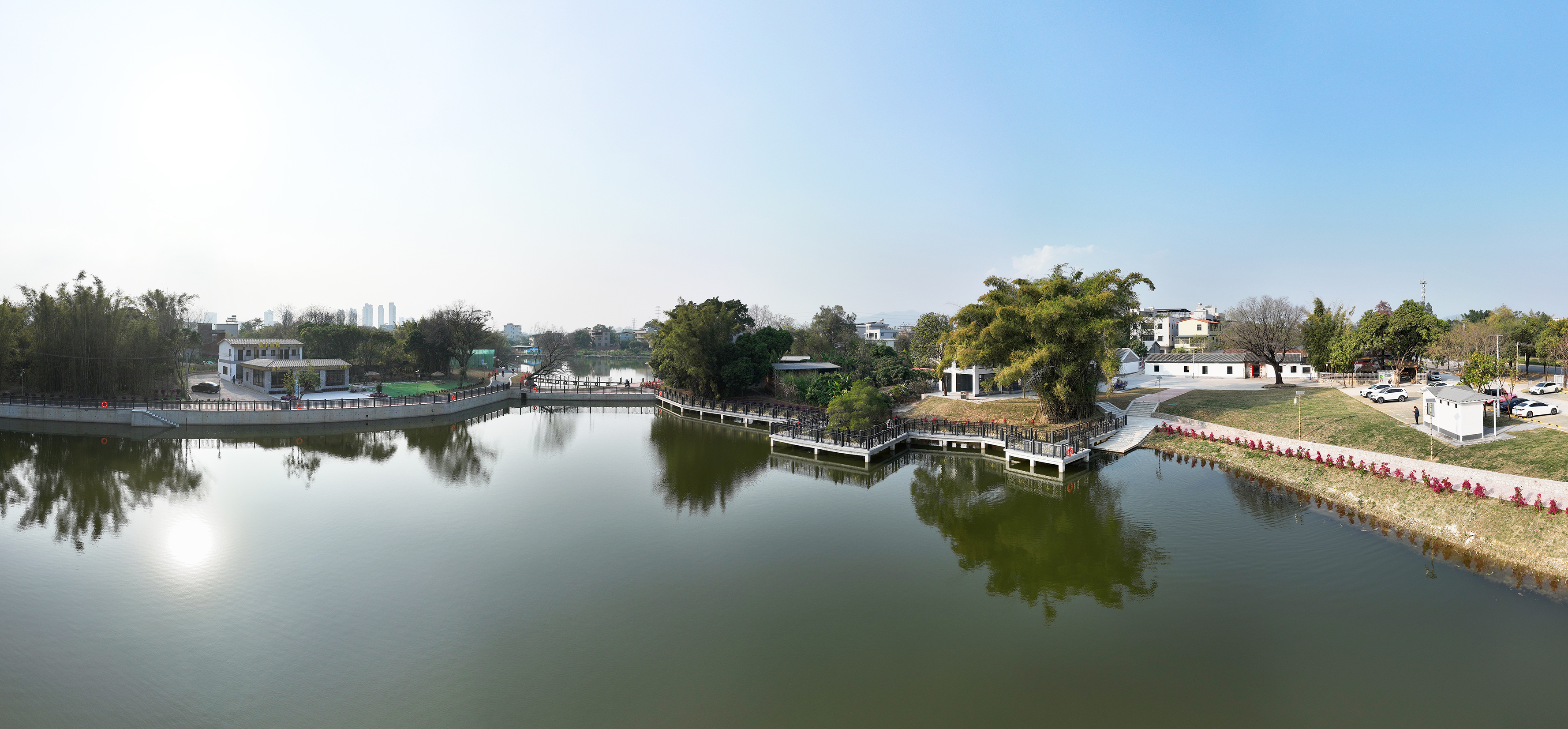 走進(jìn)星光穗園,映入眼簾的是一個(gè)開闊的景觀湖,湖邊親水棧道蜿蜒向前。沿途紅艷艷的三角梅開得正好,一棵茂盛的相思樹橫向湖面,演繹出“疏影橫斜水清淺”的意境。三三兩兩的村民和游客行走其間,在一處處美景前停留打卡。竹林掩映下,修舊如舊的老屋已有商家入駐開門納客。