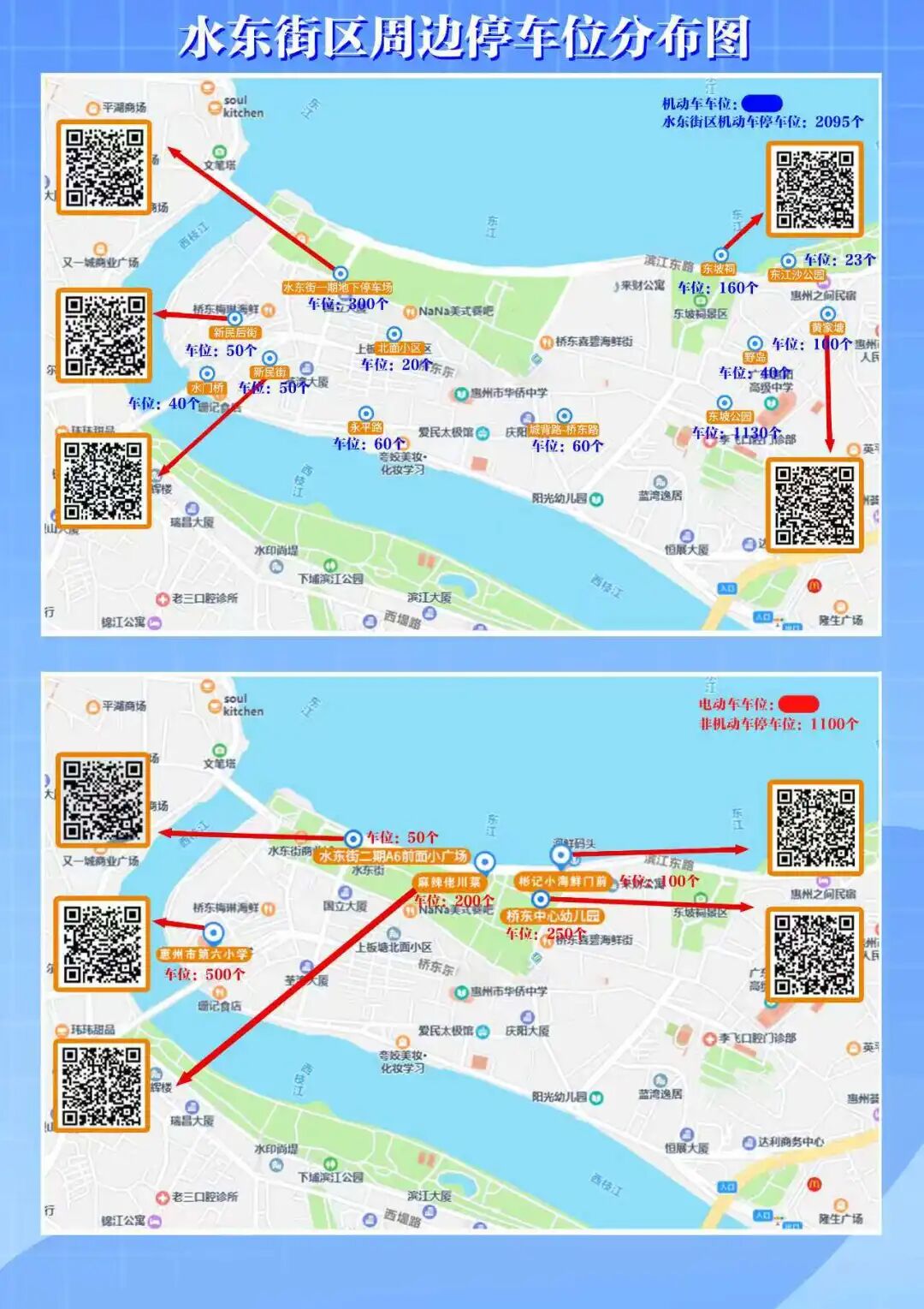 春節(jié)假期(2026年2月16日除夕至2月23日年初七),為方便市民游客出行,堅持“疏導(dǎo)結(jié)合、便民利民”原則,惠城區(qū)橋東街道在水東街周邊設(shè)置機動車、非機動車指定停放點,其中機動車停車位超2000個,非機動車停車位超1000個,掃描停車分布圖二維碼可一鍵導(dǎo)航,直達(dá)就近停車場。