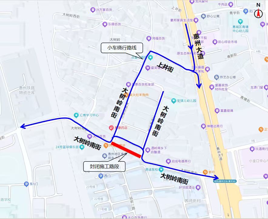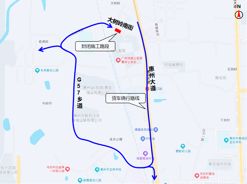 交通管制期間,原經(jīng)大樹嶺南街(中段)的小型汽車,建議通過上井街-大樹嶺南街(未封閉路段)繞行;原經(jīng)大樹嶺南街(中段)的大貨車,建議通過惠州大道-G57鄉(xiāng)道繞行。