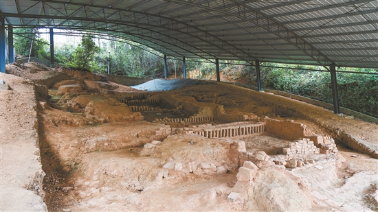 白馬窯場(chǎng)所屬的三官坑窯址坐落于蓮花山脈西段西枝江腹地的丘陵谷地之中,窯址位于半山腰處,順著山勢(shì),土黃色的磚石結(jié)構(gòu)一級(jí)級(jí)向上延伸。由于完成了階段性研究,這處古窯址上已建造了大棚進(jìn)行保護(hù)。在山林背后,有兩處窯址剛完成階段性發(fā)掘。