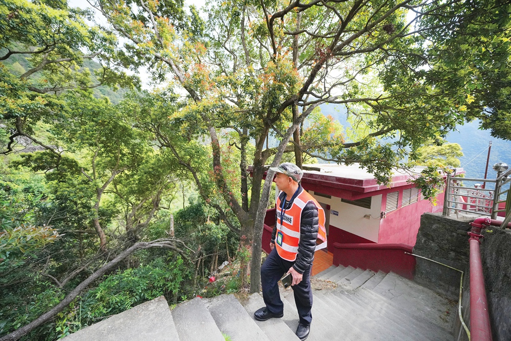 今年41歲的護(hù)林員嚴(yán)達(dá)權(quán)沒有“偷得浮生半日閑”的心情,走在寺廟外的小徑上,他不忘時刻保持警惕,觀察四周煙火情況。剛完成上午的巡護(hù),看到不少香客進(jìn)大南山龍巖寺,他下午還需再來巡護(hù)。