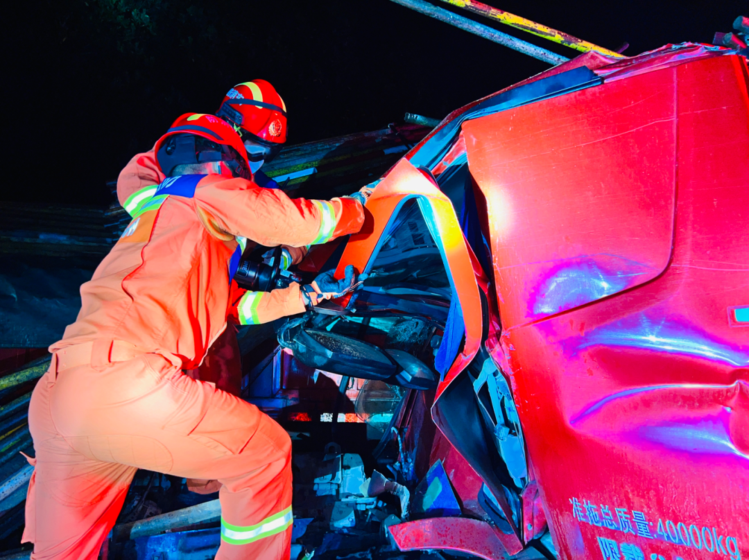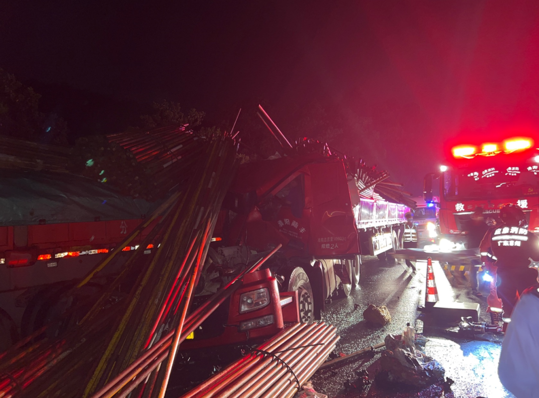 現(xiàn)場(chǎng)消防員發(fā)現(xiàn)2輛大貨車追尾相撞停在高速路邊,車上貨物鋼管受慣性甩出散落在道路及車頂上,貨車車頭嚴(yán)重變形,造成駕駛員被困在車內(nèi)無(wú)法活動(dòng)。
