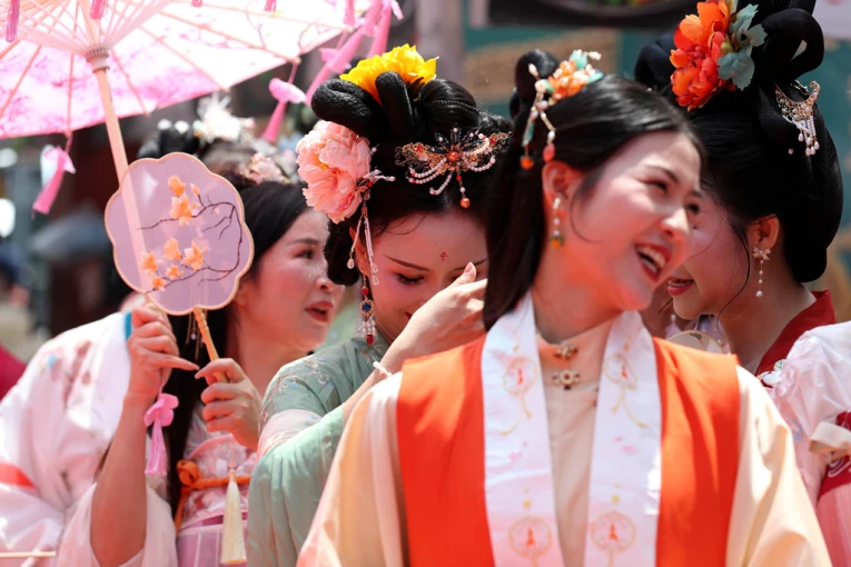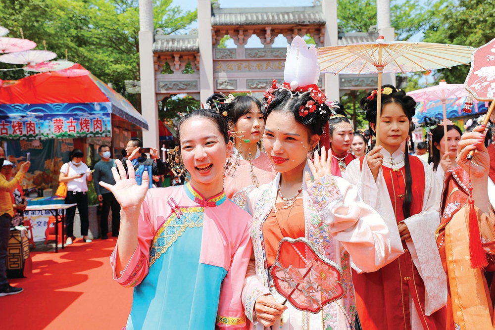 惠州日?qǐng)?bào)記者洪鵲兒(左)穿著漁民服飾與漢服爭(zhēng)奇斗艷。