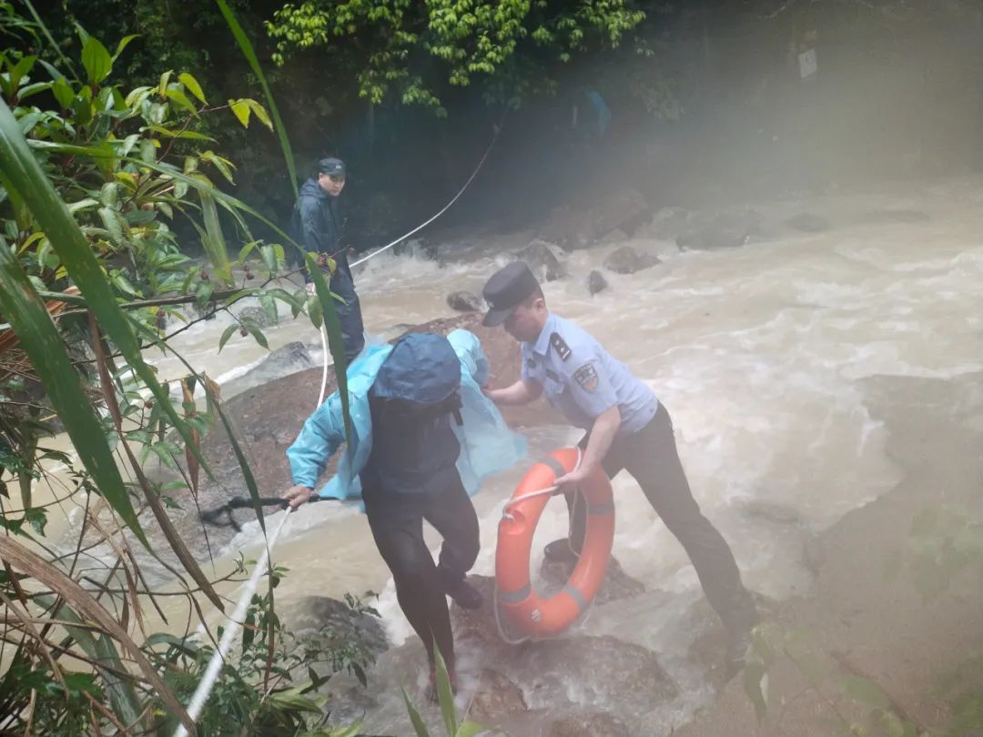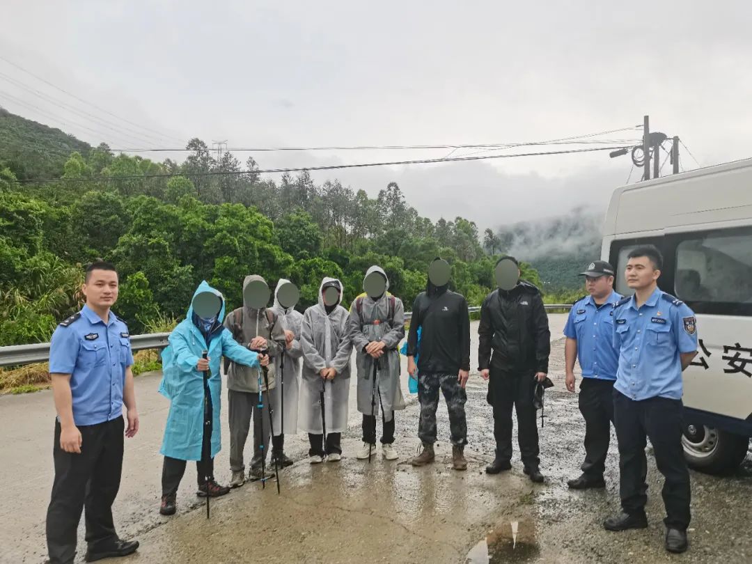 2023年5月7日下午13時(shí),九龍峰派出所接到110轉(zhuǎn)接警情稱:在九龍峰管委會(huì)長(zhǎng)坑村委南山村有7名驢友因下暴雨突遇河水暴漲被困山上,請(qǐng)求救助。接報(bào)后,值班領(lǐng)導(dǎo)立即組織警員前往救援,根據(jù)報(bào)警線索,只能確定該驢友大概的位置。山路崎嶇險(xiǎn)峻,再加上暴雨沖刷,十分濕滑泥濘,救援人員不顧艱難疲憊,背負(fù)著救援裝備,冒雨在荊棘叢生的山路上徒步1個(gè)多小時(shí),終于在山上找到了7名驢友。