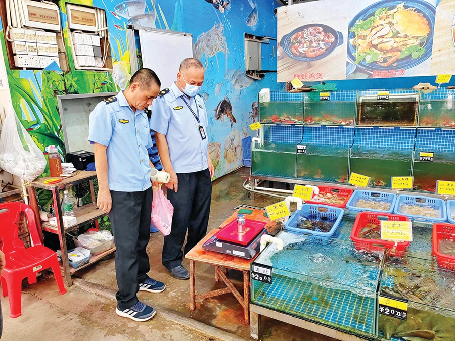 執(zhí)法人員在惠東沿海市場(chǎng)檢查商戶是否存在缺斤短兩行為。