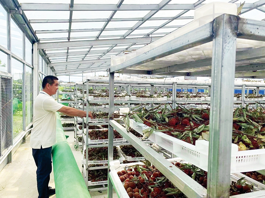 太陽能自然生曬玻璃房內(nèi)荔枝整齊擺放。