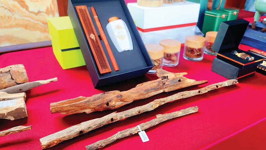 在此次研討會(huì)上,展出了眾多由惠東縣綠棋楠有關(guān)企業(yè)帶來的產(chǎn)品,除了天然的綠棋楠外,還有精致的香薰料、手串?dāng)[件等工藝品以及沉香酒等,惠東縣綠棋楠沉香全產(chǎn)業(yè)鏈條已具雛形。