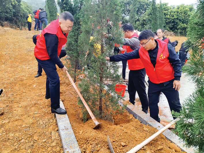 黨員干部在謝洞革命烈士紀(jì)念碑前道路兩旁種下松柏。 惠州日報記者蔡偉健 特約通訊員楊瑞發(fā) 潘佳麗 攝