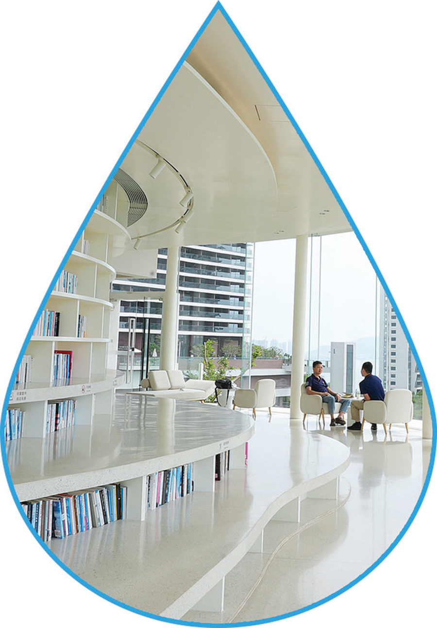 建筑主體部分平面形狀為圓形,使用空間位于水池的下方。直線是室外走廊和長墻,作為讀者和游客登臨屋頂鳥瞰大海的通道。來一滴水圖書館,一半是為了飽覽知識,另一半是為了欣賞美景。