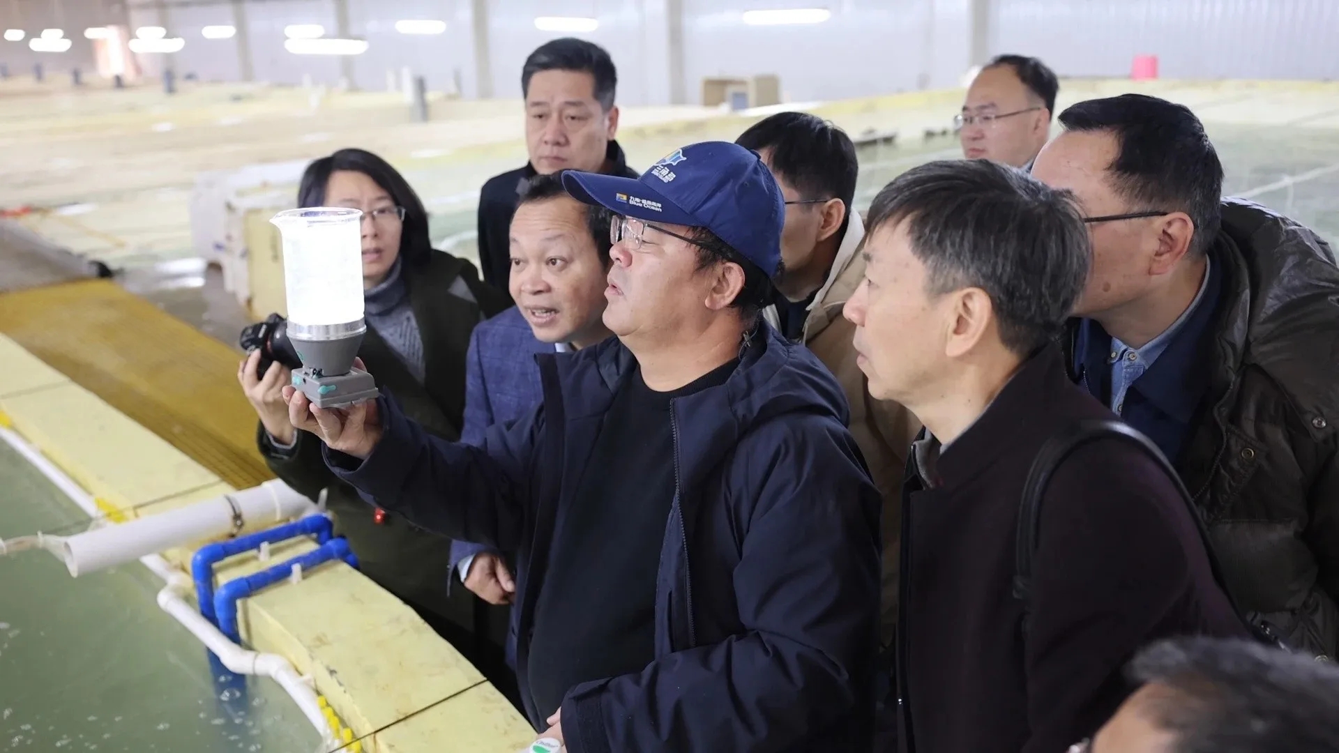 在廣東省鰉鯨海洋生物科技有限公司魚苗繁育車間,成群的硇洲族大黃魚苗游弋魚池中,輕輕用手掌擊拍養(yǎng)殖池墻壁,池內(nèi)的魚苗瞬間躍起,紛紛掠過水面,活力十足。此次驗(yàn)收會(huì)就設(shè)在該公司里。