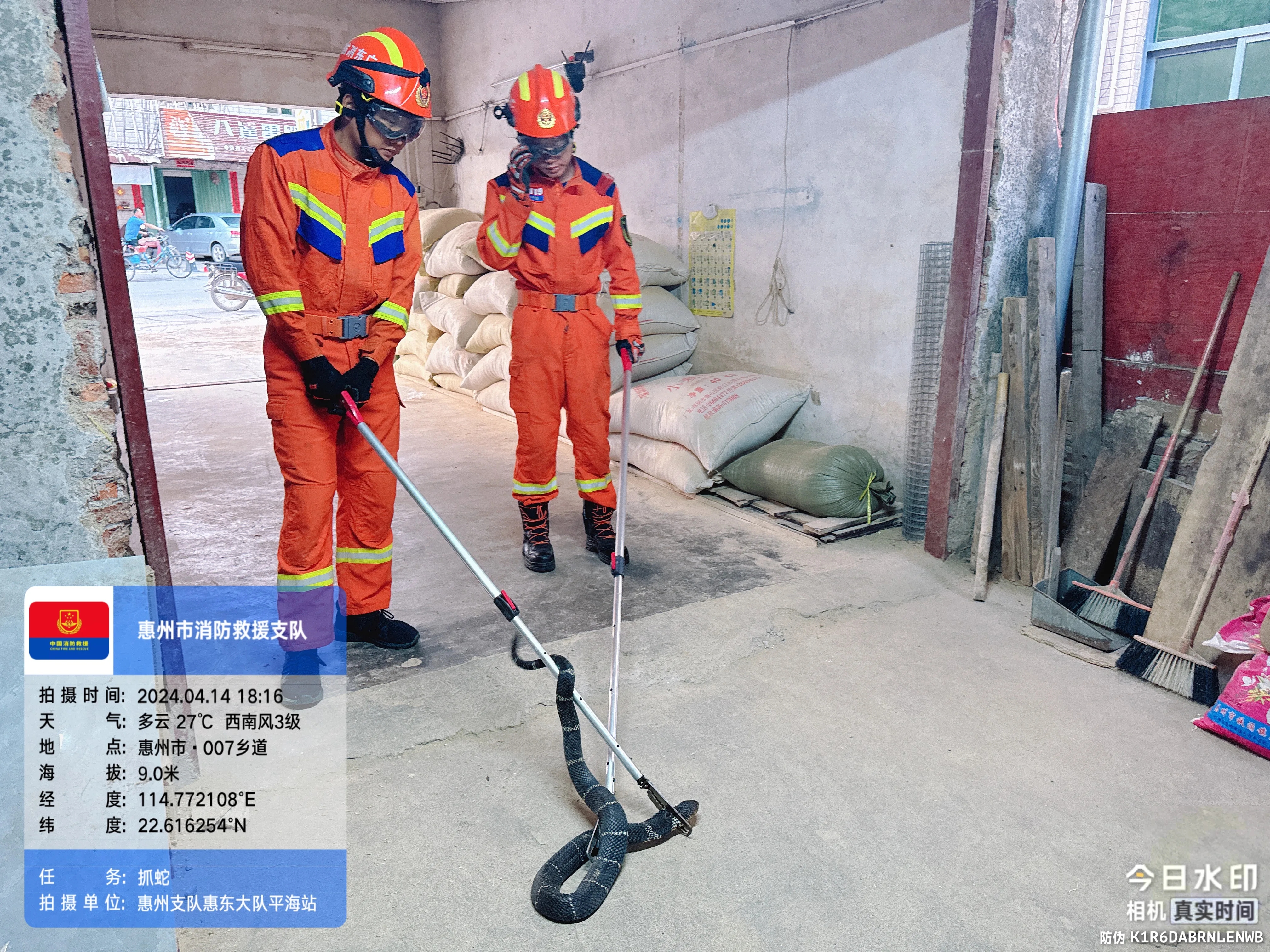 4月14日下午18時(shí)05分,惠東縣平海鎮(zhèn)碧甲村橋頭賣米店發(fā)現(xiàn)一條黑色的大蛇潛入店鋪,店主撥打119請求消防幫助;輺|消防接到警情后,立刻調(diào)派平海消防救援站趕往現(xiàn)場捕捉。