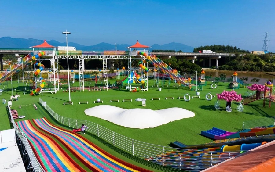 接著,可以驅(qū)車到附近的金馬田園綜合體。該綜合體集兒童樂(lè)園、農(nóng)產(chǎn)品加工、鄉(xiāng)村旅游、茶葉種植等于一體。其中的無(wú)動(dòng)力樂(lè)園擁有20多種游樂(lè)項(xiàng)目,上去便是長(zhǎng)長(zhǎng)的玻璃棧道。此外還有各式各樣漂亮的秋千、超大的蹦床、彩虹滑道等好玩的項(xiàng)目。