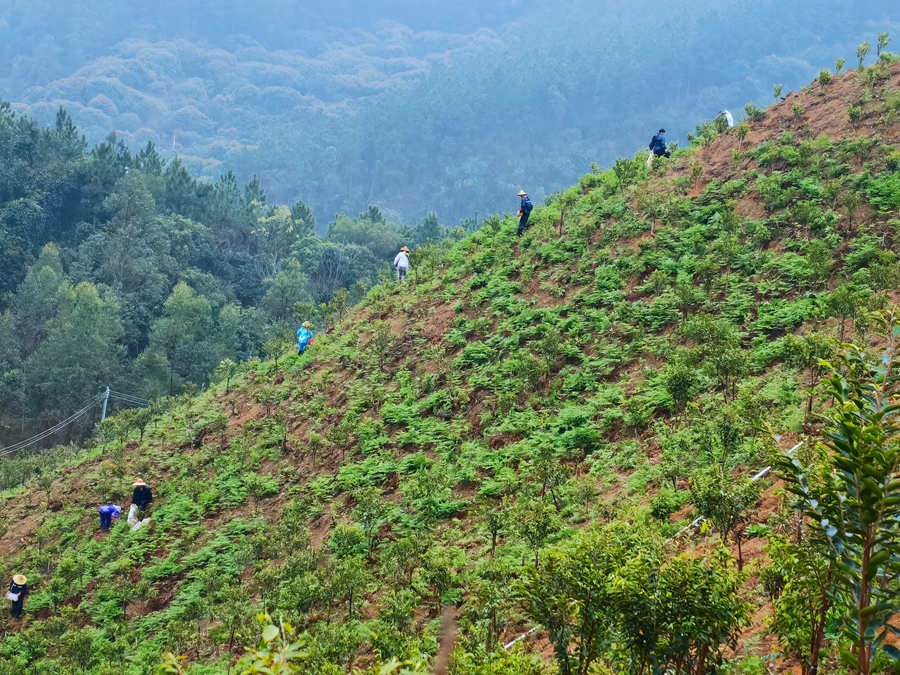農(nóng)戶在稔山鎮(zhèn)一沉香基地施肥。 惠州日?qǐng)?bào)記者洪鵲兒 通訊員李遠(yuǎn)忠 攝