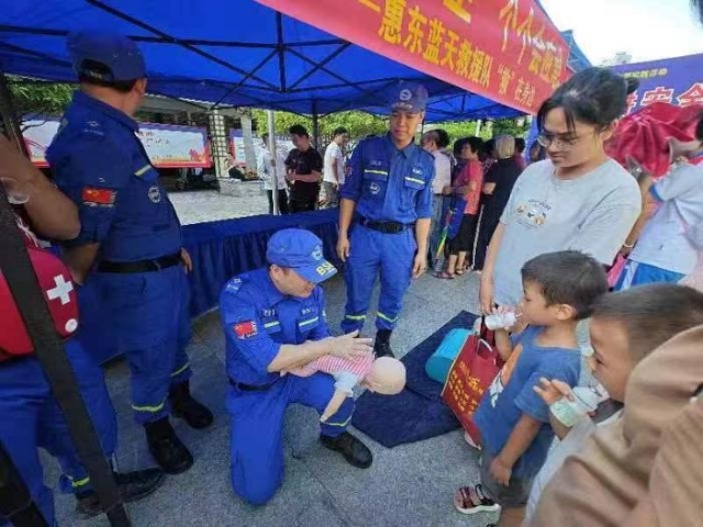 藍(lán)天救援協(xié)會隊(duì)員為群眾開展應(yīng)急救護(hù)培訓(xùn)。 惠州日報記者蔡偉健 特約通訊員葉衍達(dá) 攝