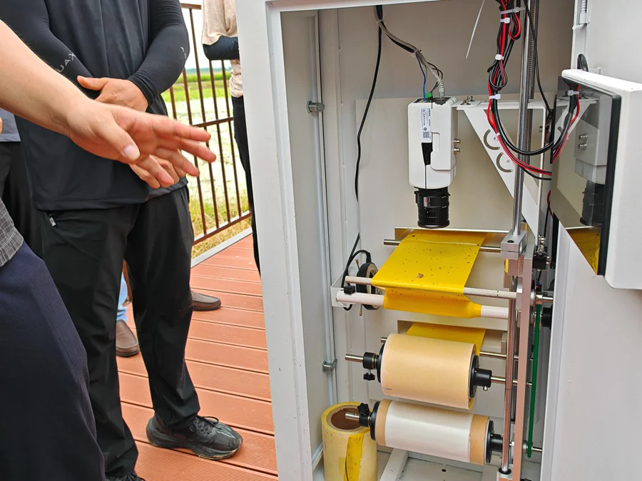 “模擬雌蟲性成熟時所散發(fā)的性激素,引誘雄蟲過來,達到殺蟲和監(jiān)測的效果”、“燈光誘集田間害蟲進入設(shè)備,儀器自動拍照識別、殺蟲,上傳相關(guān)數(shù)據(jù)”……活動現(xiàn)場,工作人員詳細講解各種智能化產(chǎn)品的技術(shù)原理和作用。