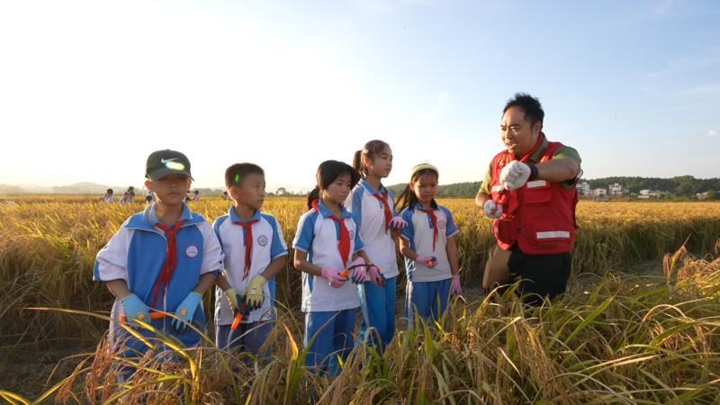 “同學(xué)們排好隊(duì),先把手套戴好,小心手中的鐮刀,聽從老師和志愿者的引導(dǎo)!秉h員志愿者一邊提醒,一邊給3~6年級(jí)學(xué)生遞上鐮刀,帶著大家走進(jìn)稻田體驗(yàn)收割稻谷,感受勞動(dòng)帶來的豐收喜悅。鎮(zhèn)班子成員們帶著孩子們一邊在稻田里干農(nóng)活,一邊為孩子們講解收割技巧。