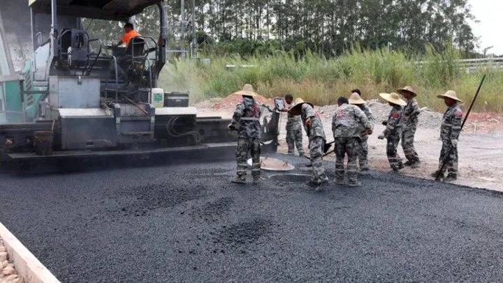工人們正在攤鋪瀝青路面。