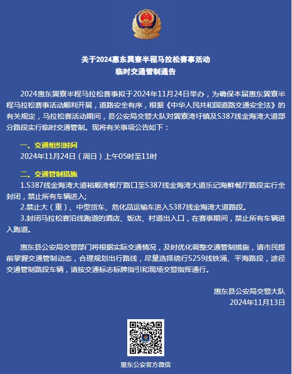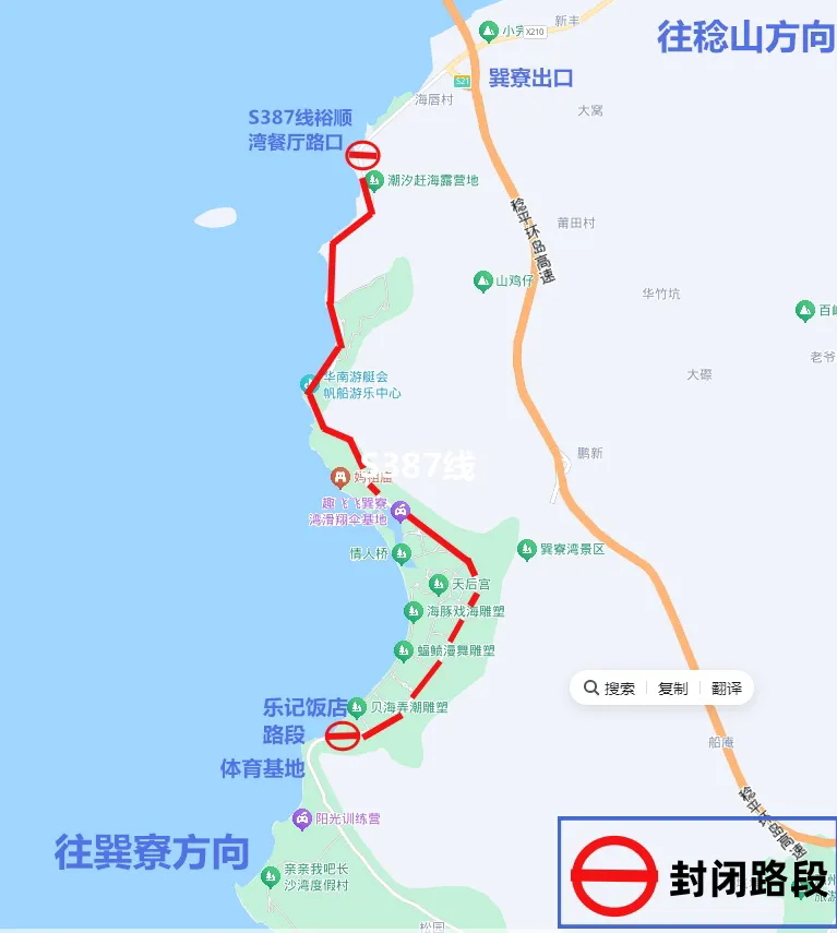 圖丨S387線金海灣大道裕順灣餐廳路口至S387線金海灣大道樂記海鮮餐廳路段實行全封閉。