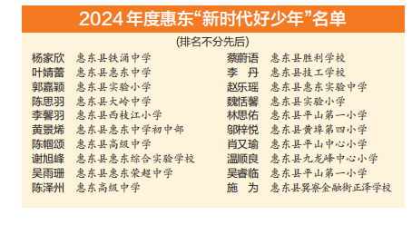 近年來(lái),惠東縣廣泛開(kāi)展“新時(shí)代好少年”學(xué)習(xí)宣傳活動(dòng),突出價(jià)值導(dǎo)向、注重實(shí)踐養(yǎng)成,在全縣廣大青少年中形成“人人踐行社會(huì)主義核心價(jià)值觀,爭(zhēng)當(dāng)時(shí)代新人”的生動(dòng)局面。截至目前,惠東縣共有廣東“新時(shí)代好少年”1名,惠州“新時(shí)代好少年”37名,惠東“新時(shí)代好少年”136名。